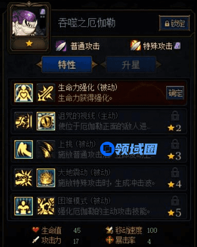 吞噬之厄伽勒的加点同样推荐作为前排肉坦,相对白斯来说,厄伽勒的控制能力更强,五星可以让主动技能提供长达3秒的控制效果。