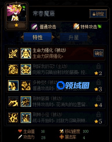 常春魔藤推荐作为辅助控制卡的加点,主动技能和4星的荆棘藤蔓5星的荆棘小径都能对目标进行束缚。