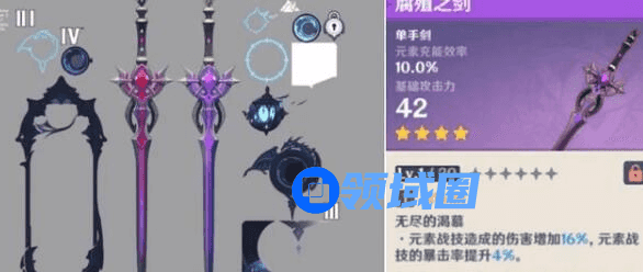 单手剑,基础攻击42,副属性充能效率,特效是元素战技造成的伤害增加16%,元素战技暴击率增加4%。