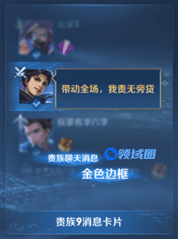 贵族9及以上召唤师,在聊天频道(综合/好友/战队)、选将阶段等将有新的表现形式,改变聊天字色、背景及聊天边框