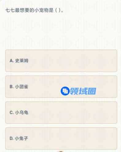 原神七七最想要的宠物是派蒙的十万个为什么答题活动中的题目,选项有:小乌龟、小兔子、小团雀、史莱姆,那么原神七七最想要的宠物是什么?游戏宝小编为您带来原神七七最想要的宠物答题答案。