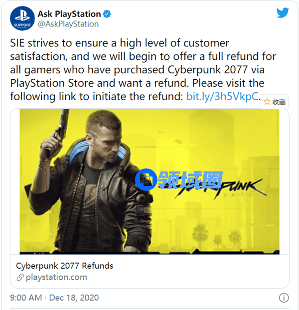 索尼PlayStation商店下架《赛博朋克2077》:开始提供全额退款