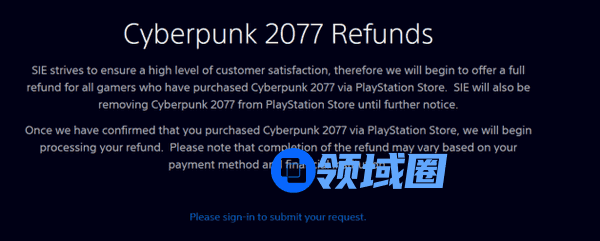 官方表示:为了确保客户满意度,我们允许所有《赛博朋克2077》购买者在PlayStaion平台全额退款。我们也会在PlayStaion商城下架《赛博朋克2077》。当您申请退款,一旦我们确认您在PlayStaion商城购买了《赛博朋克2077》这款游戏之后,我们就会开始安排退款事项。请注意,您的退款完成方式会随着您的支付方式和账户状况而有所变化。