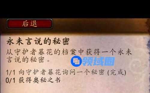 任务要求:从守护者暮花的档案中获得一个永未言说的秘密。需要向守护者暮花询问一个秘密,还有就是获得奥秘之书。