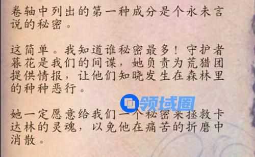 永未言说的秘密任务描述:卷轴中列出的第一种成分是个永未言说的秘密,这简单,我知道谁的秘密最多,守护者暮花是我们的间谍,她负责为荒猎团提供情报,让他们知晓发生在森林里的种种恶行。