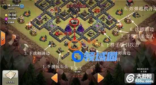 简单说明一下:图片上的文字前面的序号可以说明顺序,简单来说就是六点下石头,法师,女王吸引援兵然后女王法师杀援兵,4点位置四个黑胖吸引迫击炮及其他建筑攻击,趁机开墙,然后清边,然后再下男人杀对面的女人,他的女王位置靠外,男人不走偏是可以杀的。