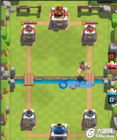 这是我觉得用猪进攻非常重要的一个技巧。常见的跳过河的位置如下(距离桥3格的位置),放在这里住会直接跳到对面接近路的位置,比在桥头放稍快。但缺点也很明显,对手在中场放置的各种建筑物都会吸引猪的走位,有的时候反而不如在桥头位置下猪。