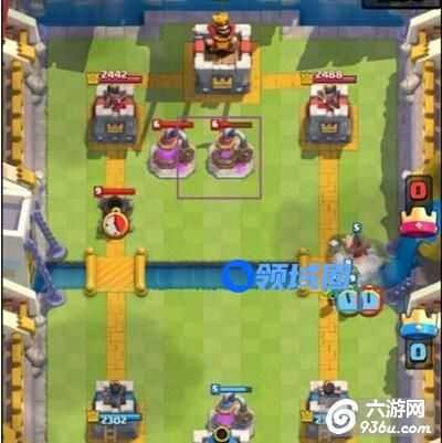 上传这样的好处是石头人巨人会在攻击完防御建筑后攻击采集器。而在防御大皮卡的时候,可以如图在向左(如攻左边则向右)偏移一个格子,然后用杂毛将皮卡拉倒防御建筑处,可以为女王塔多争取一些血量。在有对面有双骑的对局中,如果费用允许可以在加农炮前面在顶一些小单位挡一下冲锋伤害,否则加农被秒还是有些亏的。