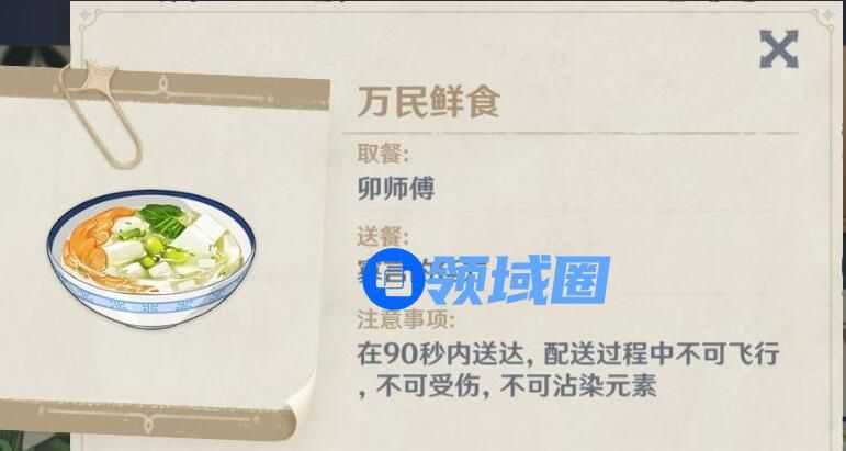 我们需要送到npc延方手中,条件是在90秒之内送达,而途中不能飞行,不能受伤,不能沾染元素。意味着我们只能靠着自己走过去,且不能和其他敌人战斗,否则沾染到其他元素会导致任务失败。但是可以冲刺奔跑,能够节省非常多的时间。