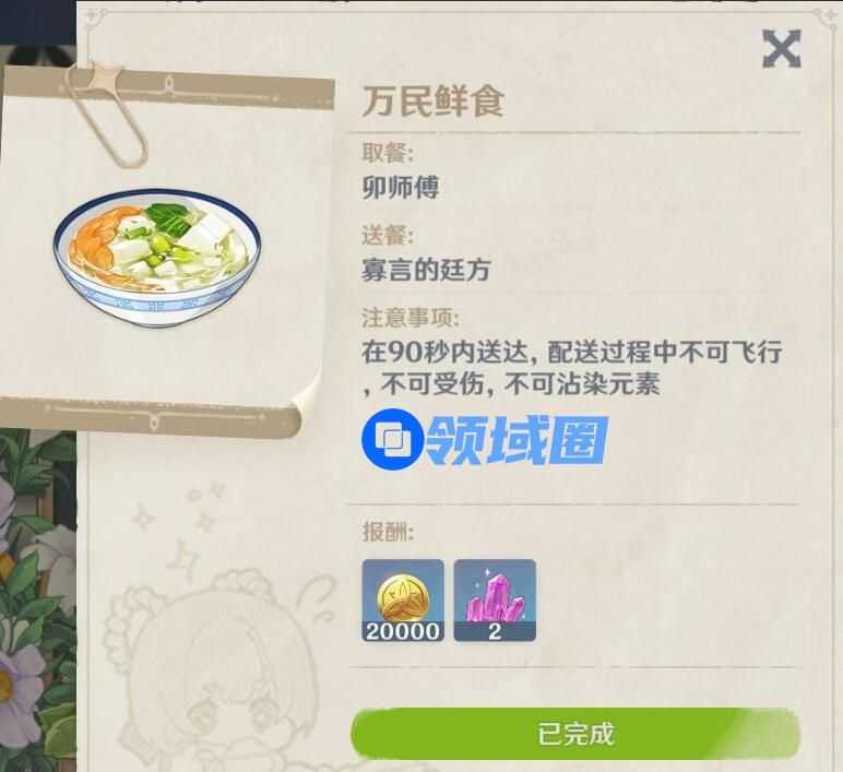 我们就沿着最短的路线,来到npc延方的位置这里,和他进行对话,将餐品送到他的手中即可完成最后一个万民鲜食的任务。完成这个任务能够额外获得2万摩拉以及两个武器狗粮的奖励。