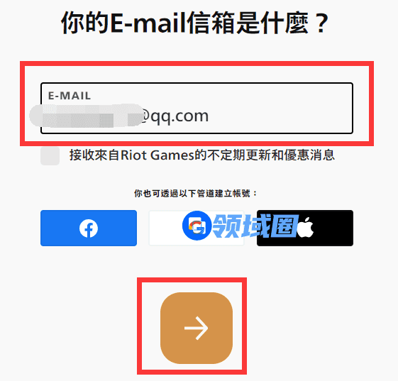 首先是让你填写注册邮箱,QQ邮箱就可以。下面的接受Riot Games消息的选项可以不用选,填写完毕之后直接点击下一步按钮。