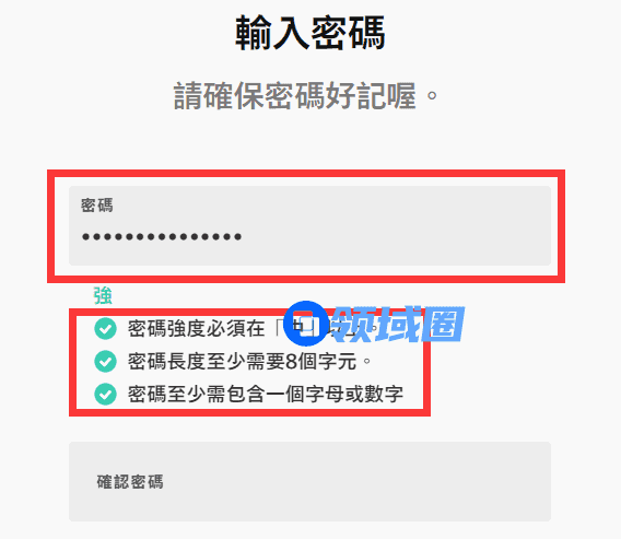 最后就是输入密码了,密码的要求官方也直接给出了,填写两遍就完成了,点击确认进行注册就可以了。