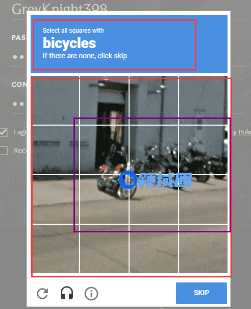 验证系统的工作原理也很简单,上面加粗加大的单词是一个名词,代表了一个物品,我们需要做的就是在下面数张张小图中点击选择全部包含这个物品的图片,也就是紫色框里的六张图片。