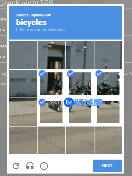以此图为例,“bicycles”单词的意思是自行车、脚踏车。EMMM,虽然我不知道为啥图里只有摩托车,意思理解就行了,反正都是车,将小图中包含摩托车的图片都选中后,就可以点击右下角的按钮进行验证了。