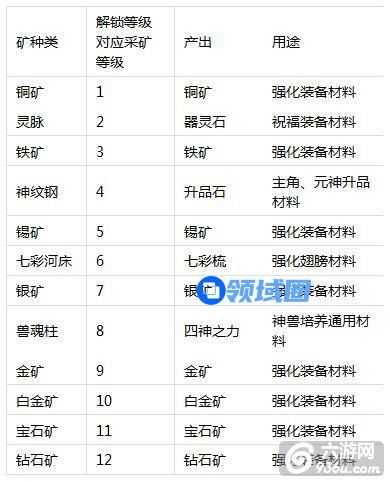 矿山,材料主要来源,强化、祝福装备,人物或者元神升品(升阶),强化神兽。矿种类分为:铜矿、灵脉、铁矿、神纹钢、锡矿、七彩河床、银矿等十多种。当玩家达到6级时开启矿山2种玩法。