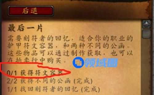 除了符文容器外,最后一片任务还需要用到两个公函,刻符者的回忆,公函拍卖行就有卖的,这个回忆就是爬塔的核心橙,去做橙装哪里,右键包里的橙装回忆,读个条,和npc对话,就可以做橙装了。