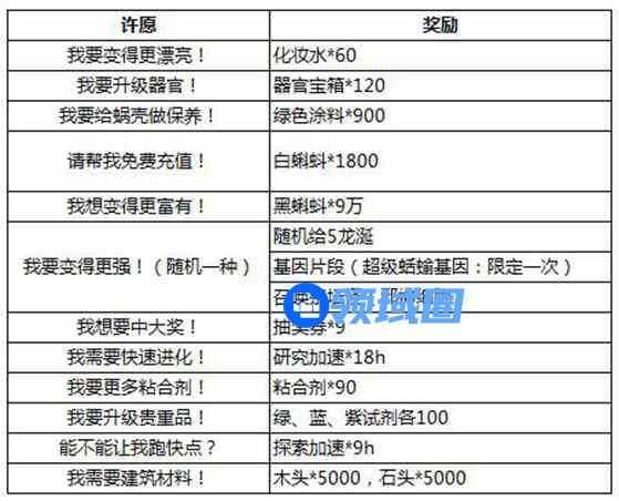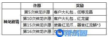 注:许愿只会出现一次的就归为限定类了;第5、10、15、16、20次召唤神龙会触发神龙剧情,具体奖励见表格。