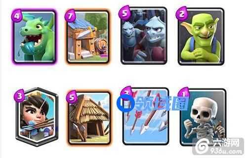 哥布林小屋:核心卡,比野蛮人小屋平滑许多,可以用来挡对方骑兵并且很多时候可以没什么顾及的放下。由于现在闪电/火箭/火球的减少,哥布林房子经常可以存活很久,再搭配上这套卡组的快速过牌,有时候场上可以同时存在两个血量很高的房子,这种时候很容易就一波推掉对面的塔了。