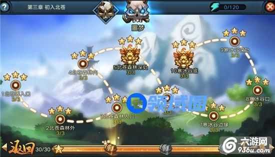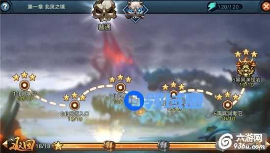 通过点击界面右下部的“冒险”图标即可进入普通关卡,普通关卡由十六个主线剧情章节组成,每一个剧情主线章节内包含若干个子关卡(如下图所示),点击剧情章节图标即可进入。