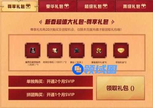 2.对于高级礼包、超级礼包、豪华礼包,每类礼包每人最多可购买10次,尊享礼包最多可购买20次;