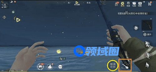 2、让后将工具切换成鱼竿,到附近水域,放鱼竿;