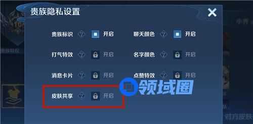 打开贵族隐私设置后,最下面的那个功能,就是开启和关闭皮肤共享用的,取消其选中状态,届时皮肤共享特权就关闭了。