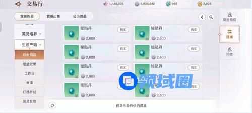 第二步:打开交易行一摆摊一生活产物一回血回蓝,购买一颖“秘贴丹”,并继续与【锦葵】对话。