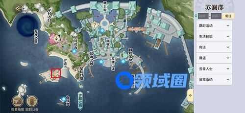 首先玩家直接来到这个苏澜郡的左下角,有个岛屿,如图所示的红圈的位置。