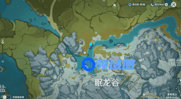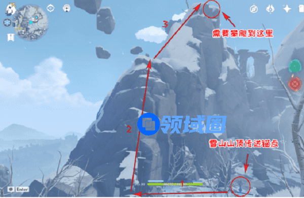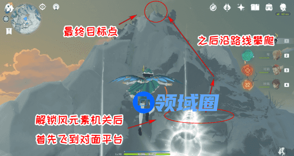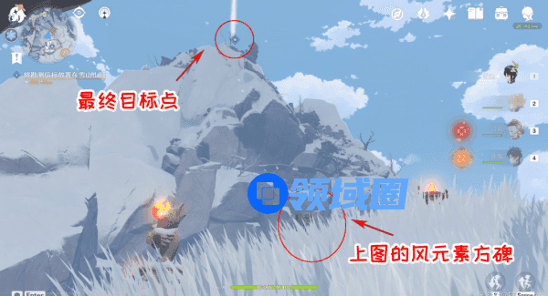 因此,为了降低难度,我们可以选择迂回的办法,首先爬到西北边较矮的山顶,然后通过风元素技能触发风场机关飞到对面,之后再向上攀爬,这个路线全程都会有火堆,不用担心严寒值积累的问题,具体流程如下。