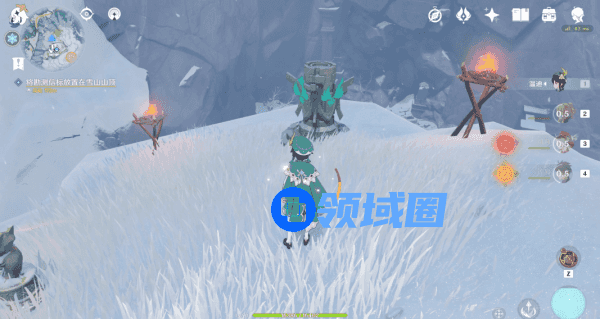 在篝火旁缓解一下严寒值后,就可以通过风元素技能来解锁风场,首先飞到对面的平台,平台上有篝火,可以取暖,严寒值消除后沿路线向上爬至山顶放置信标即可,具体路线图如下。