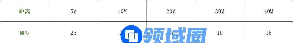 上图是MP5的面板数据,和其他冲锋枪相比,它在机动性、射速及射程方面优势较大,但伤害、精准度和控制表现一般。从外观来看,这把武器给人一种短小精悍的感觉,虽然弹匣较长,但实际只有30发子弹,很有必要更换弹药更多的弹匣。在训练场中无配件测得MP5对目标胸部的伤害如下: