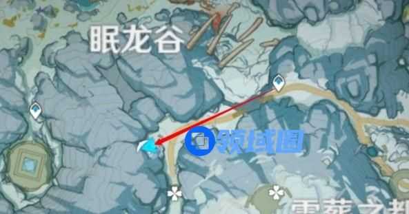 位于大地图眠龙谷的下方,从一处传送锚点很好找到。在标记处的一处高台上,下附一张实景图。