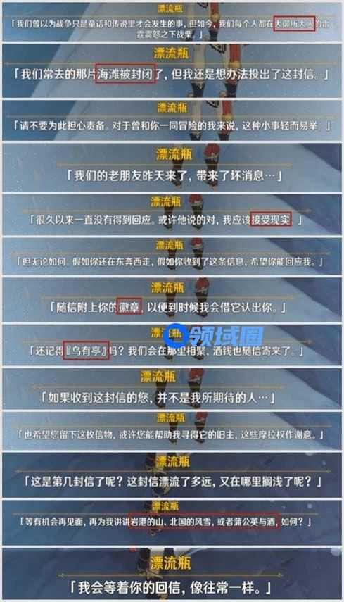 首先,我们可以从碎片中得知,漂流瓶不只发出了三个。我们拾取到的或许只是众多漂流瓶中的几个,而漂流瓶的主人是想通过这种方式寻找一个音讯全无的友人。其中【战争】与【大御所大人的雷霆号之怒】说明了漂流瓶的主人处于战乱之中,无法亲自去大陆其他地方寻找他的友人。或许也只有这样,才能理解他丢出一个又一个瓶子的用意。