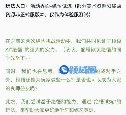 体验服是在大厅——活动界面——绝悟试炼,这个入口比较特殊是“活动”界面里,正式服预计会改一下入口,除非这个也是限时活动类,只在新英雄上线时才出。