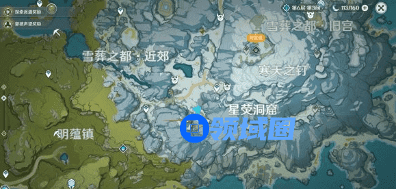 星荧洞窟遗迹位置如下图,来到下图中的传送点之后,打开地图可以看到左下角有个看起来像水池的遗迹。