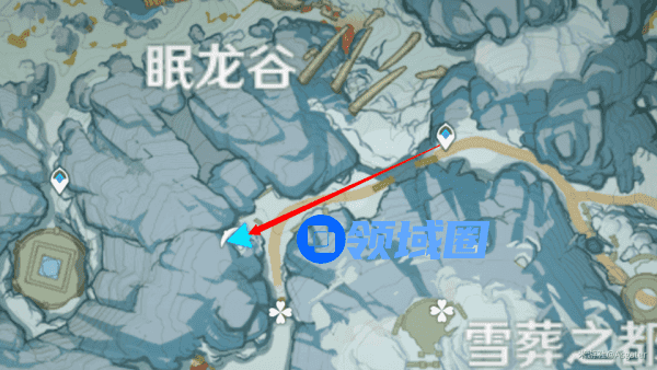 位于大地图眠龙谷的下方,从一处传送锚点很好找到。在标记处的一处高台上,下附一张实景图。