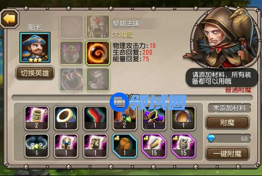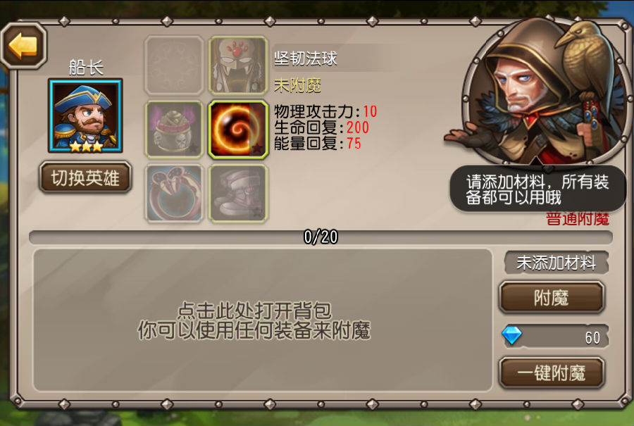 选好英雄,并选择英雄身上要附魔的装备后,就可以开始添加附魔材料啦!