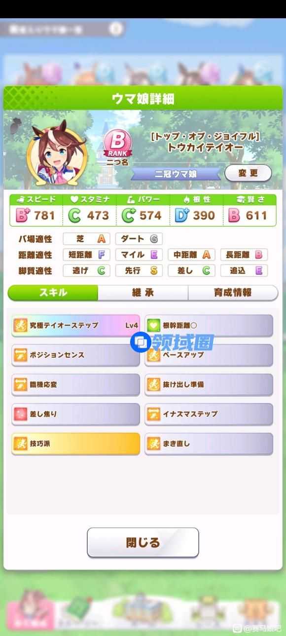 首先,帝皇作为先行马,面板要求相对较高,不能有太明显的短板,不像逃马一样可以专心点速度,必须把属性维持在一定水平以上,相对的弱项至少四五百左右的数值,这就导致我们育成的压力相对较大,需要近似五边形的面板。我这套主点智商和速度,次点爆发,再配合技能将冠军直接拿下。
