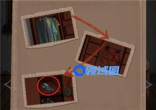 1、转到走道(楼梯处),上楼,进入左边房间(主人公卧室),点击墙上的结婚照拼好,得到镶嵌物1