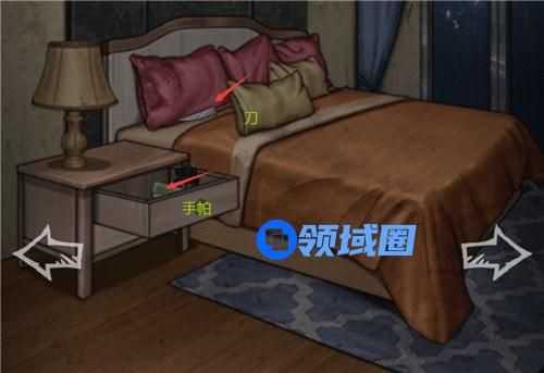9、出去,用钥匙打开右边的客房,点击床头柜,点击里面绿色的东西,得到手帕,点击枕头边的小刀