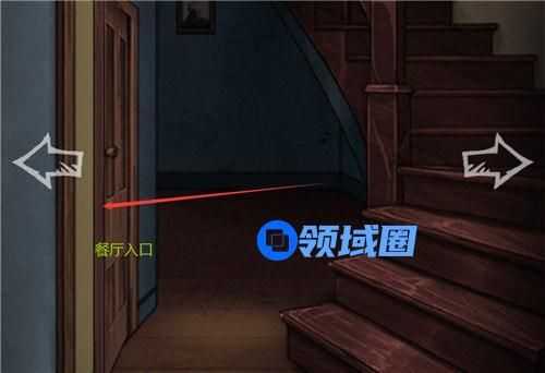 3、点击右箭头,进入楼梯处,点击楼梯旁边的右侧门进入餐厅,点击右箭头,用刚得到的钥匙打开门,进去厨房