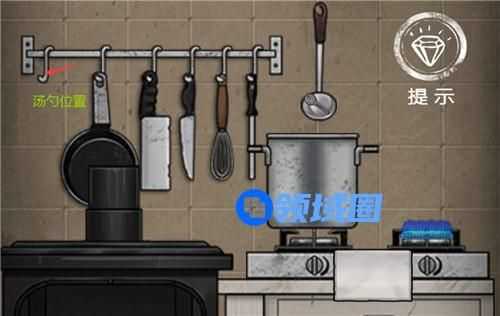 4、点击架子上挂着的汤勺,放入高压锅中搅动,得到一枚钥匙
