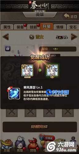 觉醒完成后雪女即可获得全新的觉醒技——寒风萧瑟。该技能为被动技能,出场时雪女吹奏寒曲,使所有内力攻击低于雪女自身内力攻击70%的敌方单位在5秒内降低攻击速度。
