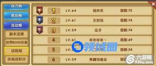 试练塔排行榜:通过统计当前所有玩家试练塔闯关进度进行排名,通过试练塔层数越高排名越向前。