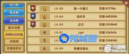 世界BOSS伤害榜:通过对参与世界BOSS活动对BOSS造成的伤害进行排名,伤害越高排行越高。
