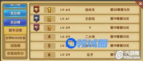 副本进度榜单:当前闯关层数越多,排名越靠前,榜单可具体到上榜玩家当前章节及详细关卡等信息。
