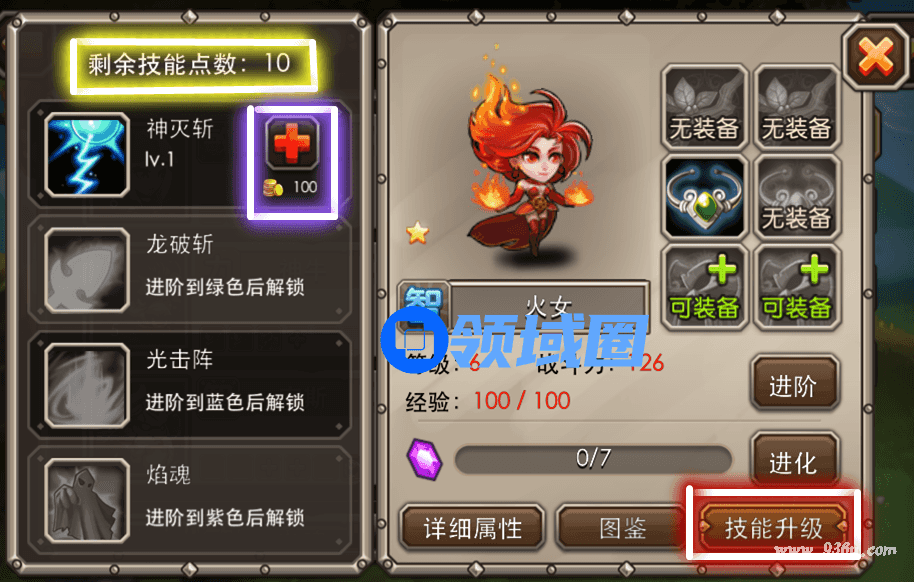 打开英雄展示界面,选择一个我们想培养的英雄,然后点击“技能升级”按钮。这里使用火女作为示范。
