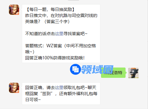 【每日一题,每日抽奖励】昨日推文中,在对抗路与司空震对线的英雄是?(答案三个字)不知道的话点击这里寻找答案吧~答题格式:WZ答案(中间不用加空格哦~)回答正确100%获得游戏奖励哦!