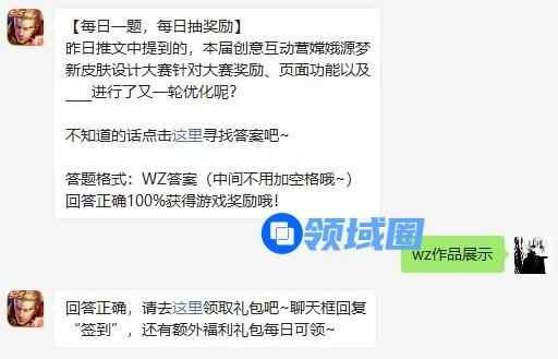 【每日一题,每日抽奖励】昨日推文中提到的,本届创意互动营嫦娥源梦新皮肤设计大赛针对大赛奖励、页面功能以及____进行了又一轮优化呢?不知道的话点击这里寻找答案吧~答题格式:WZ答案(中间不用加空格哦~)回答正确100%获得游戏奖励哦!