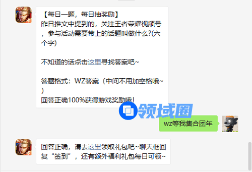 【每日一题,每日抽奖励】昨日推文中提到的,关注王者荣耀视频号,参与活动需要带上的话题叫做什么?(六个字)不知道的话点击这里寻找答案吧~答题格式:WZ答案(中间不用加空格哦~)回答正确100%获得游戏奖励哦!